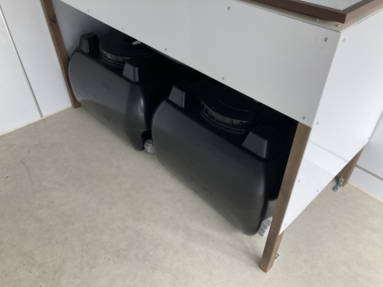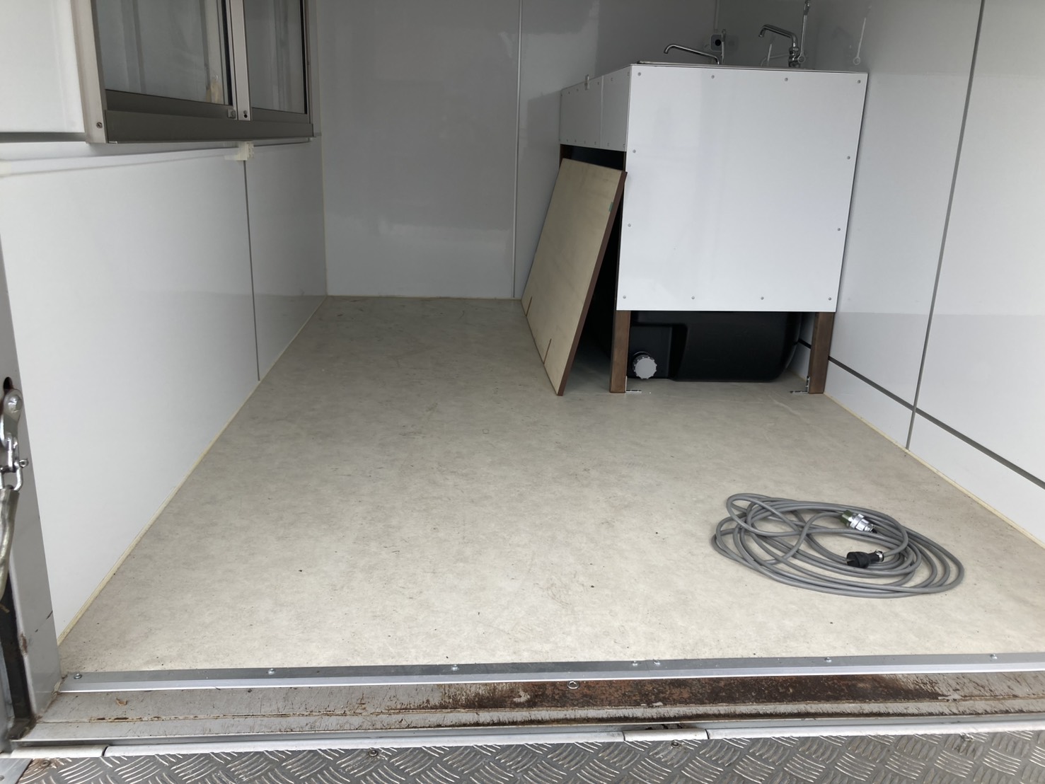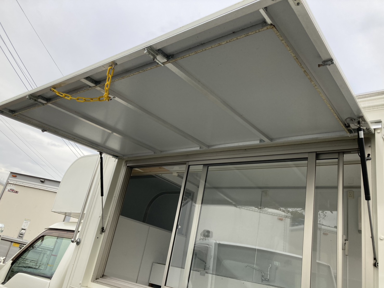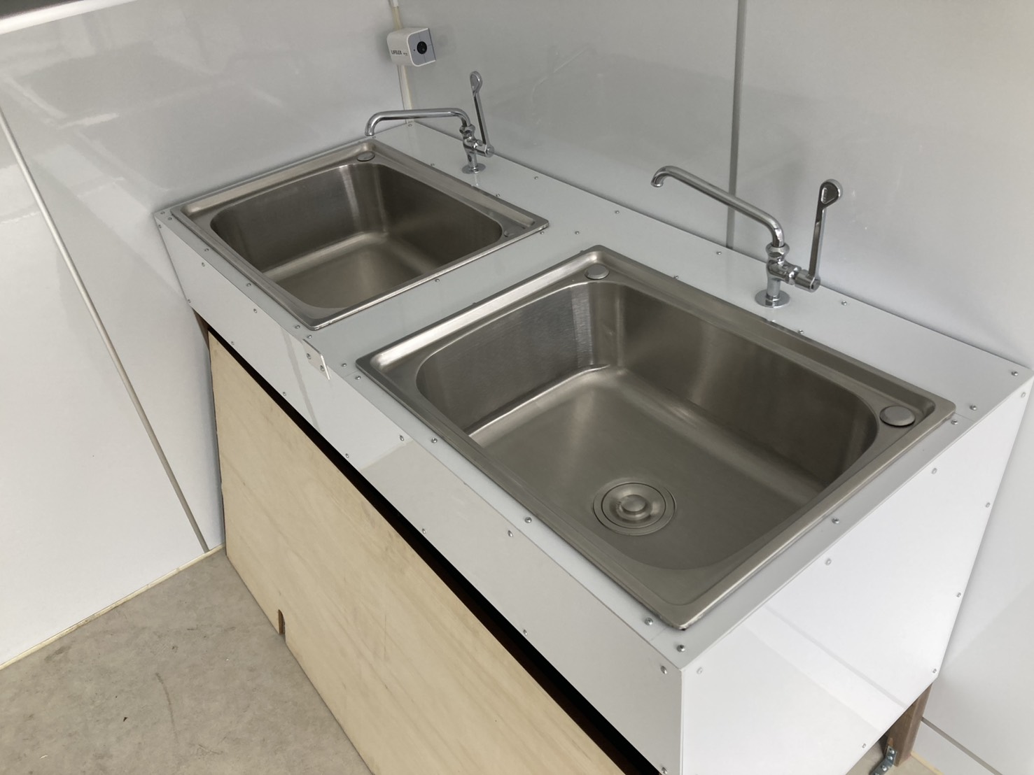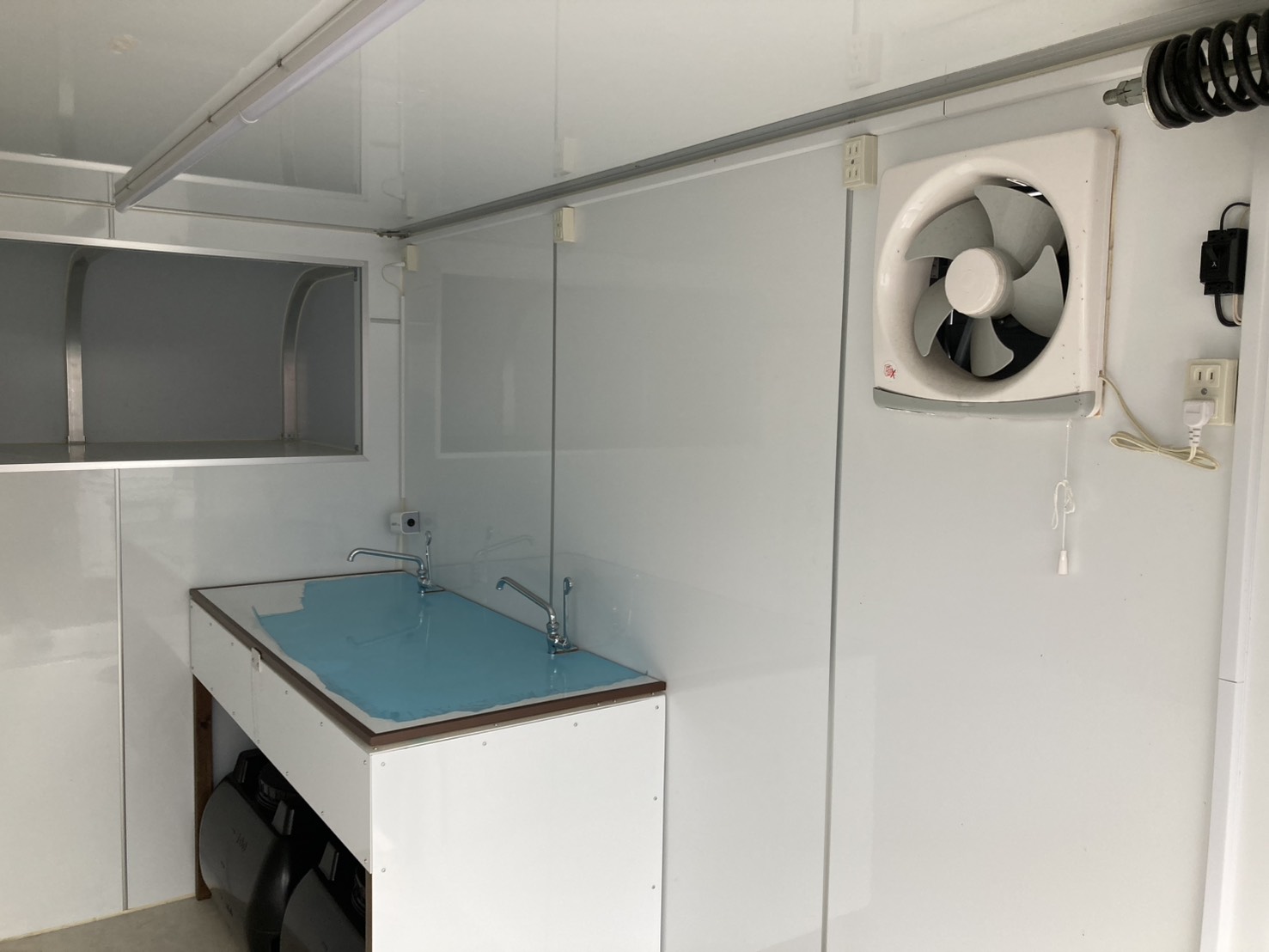 2槽シンクや給排水タンク、使いやすい跳ね上げ販売口付き。